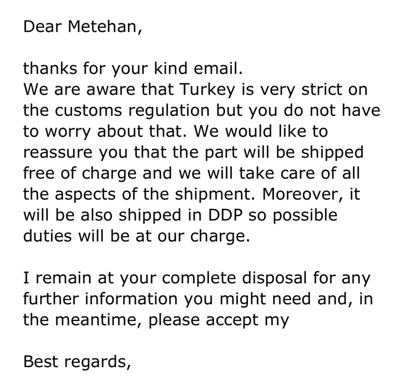 Bence aldığınız maile cevap yazıp sorun, gönderim gümrük ücreti falan nasıl olacak diye. Türkiyedeki durumu belirtin, ücret yazılırsa 150 euro sınırı olduğu için gümrükten çıkartmanızın 2 pedal parasına eşdeğer olacağına vs birşeyler yazın![]()