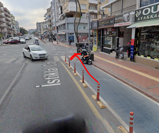 görüntü için kusura bakmayın elimde resim yok geldiğim yön tek yön sadece gidiş fakat bisiklet yolu çift yön çoğu sürücü sol tarafı kontrol etmeden yola çıkıyor normalde ya geçidinin arkasında beklemesi gerekiyor fakat sürücü arkadaş kontrol etmediği için araç harekete geçiyor .Hızım 15 20kmh arası hatırlamıyorum ama frene basmadan aracın sol ön tekerleğine çarptım çarptığım gibi havalanıp kaputun üstüne düştüm şükür ki burnum bile kanamadı ama ben kaputun üstünde arabanın içindeki 4 kadın bana bakıyor. Biraz komiğime geldi arabanın üstünden inip kendimi kontrol ettim sanırım bacağımı çarptığım sırada telefon sıkışmış V şeklinde bükülmüştü ve bataryadan dolayı ısınmıştı. Olayın sıcaklığı ile bisikleti kontrol edemedim tanıdığım birisi aracılığı ile kadının telefonunu ehliyetinin fotoğrafını çektim. Tutanak o sıra aklıma gelmedi arabada sadece far kırılmıştı ve kaput içine göçmüştü konuşup anlaştıktan sonra ben sınava yetişmek için bisikleti eve bırakıp devam ettim