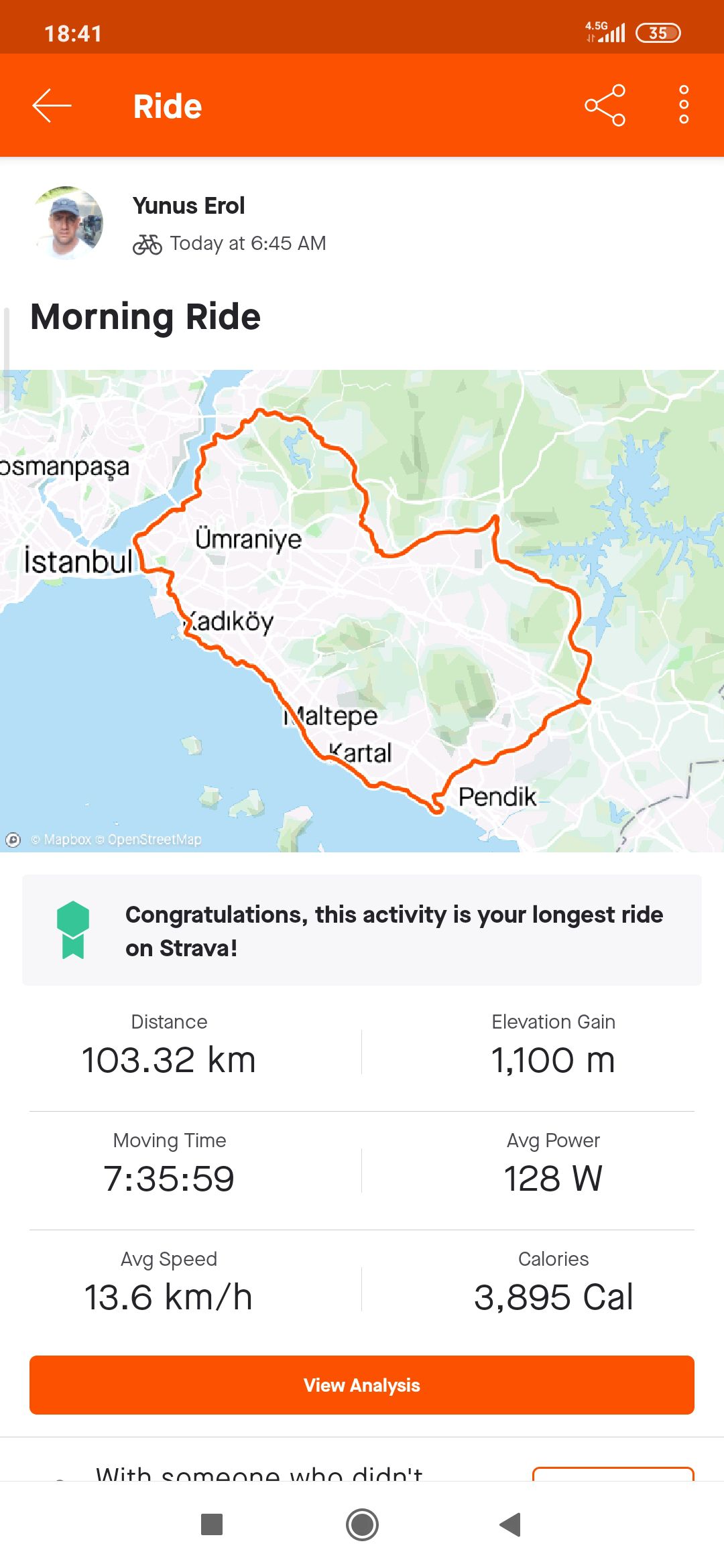 Uzun zaman sonra 100 km üzeri tur yapabildim. Çekmeköy-Kurtköy-Pendik-Kadıköy-Üsküdar-A.Hisarı-Kavacık-Çavuşbaşı-Çekmeköy 105 km. Çavuşbaşı yokuşunu bilenler vardır. Oraya kadar iyi geldim ama orada bacaklar su kaynattı kramplar ensemde boza pişti zaten çok sıcaktı öğleden sonra. Mecbur aldım elime yarım saat yürüdüm. Yaklaşık 2 seneden sonra normal. Özlemişim uzun yol yapmayı en çok da Paşaköy-Kurtköy arası yoldan keyif aldım orası şehirlerarası yol gibi 3 şeritli yol ve yanda emniyet şeridi hep çık in ivme kazan tekrar çık in en sevdiğim 😊 Herkese keyifli sürüşler.