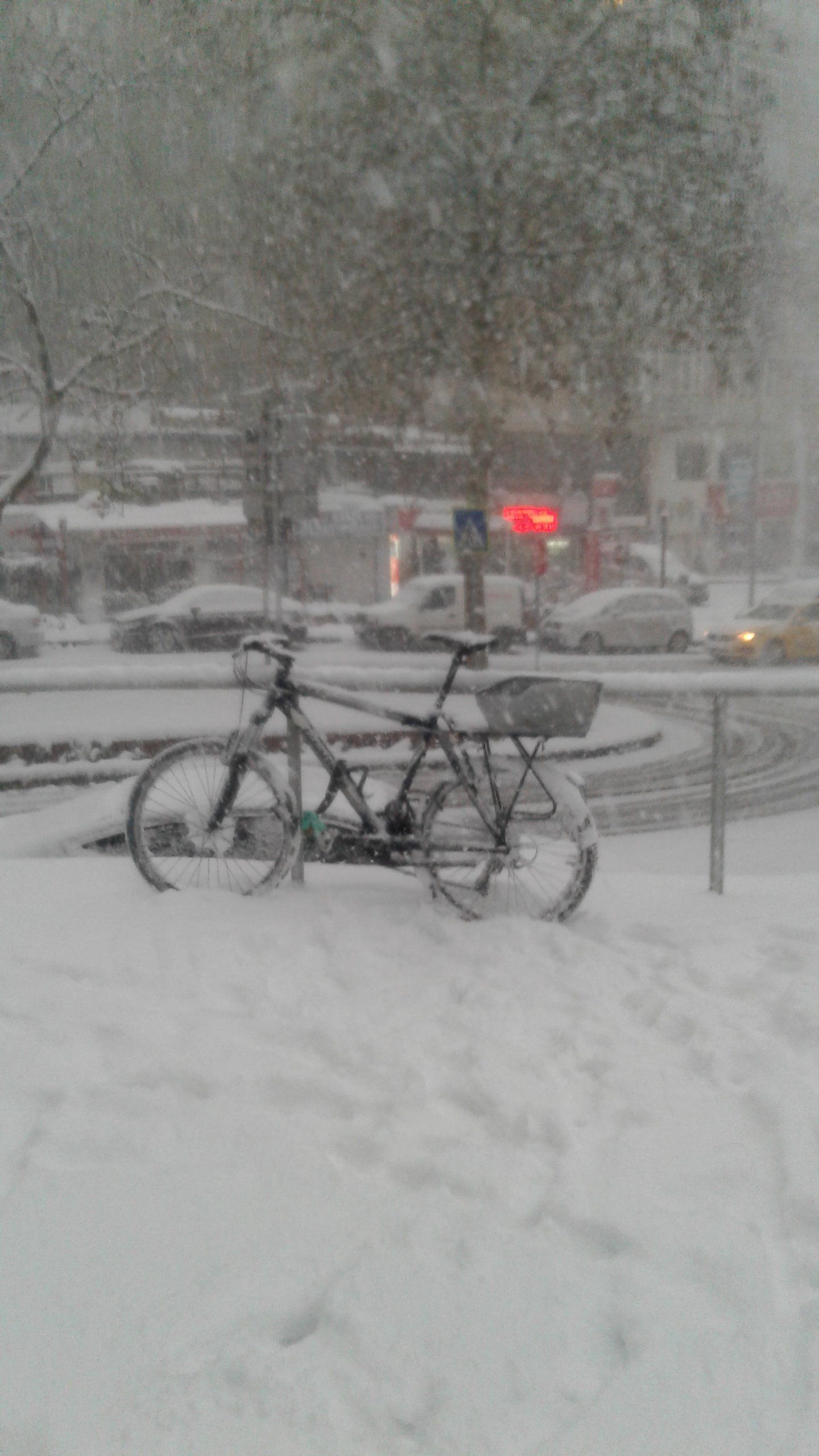 700X25C silik tekerle (dişli olsada değişmezdi) karda bisiklet sürmem bir daha. En azından yağan kar altında. 😅Sabah evden çıktım hiç bir şey yoktu. 2-3 dakika sonra sepelemeye başladı. Yollarda hafif hafif birikintiler vardı, buzlanma olsa illaki sıkıntı olurdu ama normal karda lastiklerin yol tutuşunda hiç bir sıkıntı yaşamadım. 1-2 zırto hariç araçların normale göre çok daha dikkatli olması kar ile birleşen keyfi katlıyor. Sis gözlüğün buğlaması görüşü biraz düşürse de bildiğim yolda otomatik pilotta dikkatli şekilde gideceğim yere ulaştım ve son durumda buydu.