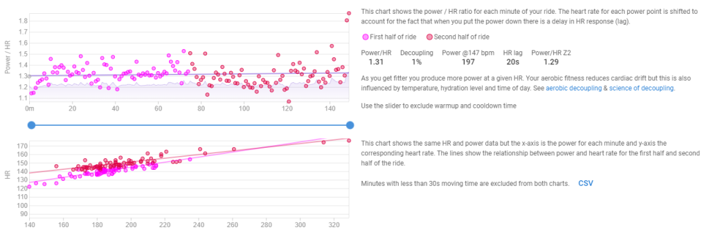 Decoupling olayıyla ilgili aşağıya geçen haftaki bir trainer sürüşünün verisini koydum. bu amaçla yapılmadı tabi ki ama uzun olduğu için bunu seçtim. bu grafiği nasıl okuyoruz? sadece 10% altını görünce tamamdır mı diyoruz?